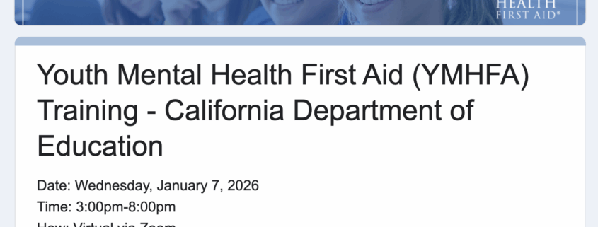 Thanks to the California Department of Education, there is an opportunity to receive Youth Mental Health First Aid Training virtually and at no cost.