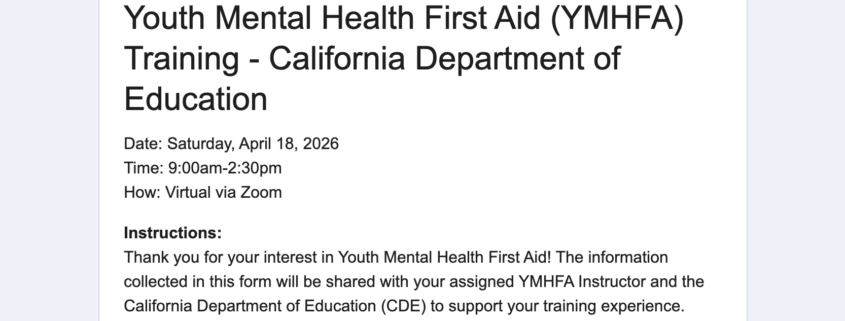 Thank you for your interest in Youth Mental Health First Aid! The information collected in this form will be shared with your assigned YMHFA Instructor and the California Department of Education (CDE) to support your training experience.
